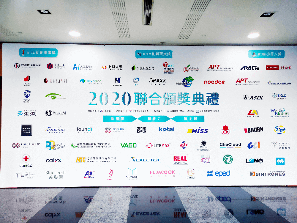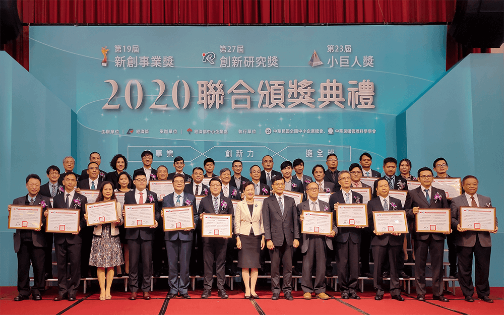 由經濟部主辦的「第19屆新創事業獎、第27屆中小企業創新研究獎暨第23屆小巨人獎」聯合頒獎典禮,於11月17日(星期二)下午5時,假臺大醫院國際會議中心舉行。今(109)年度共有16家新創企業獲選新創事業獎、35件創新標的獲得創新研究獎及15家外銷績優企業獲頒小巨人獎,經濟部王部長美花親臨為共66家優秀得獎企業頒獎,以資鼓勵。