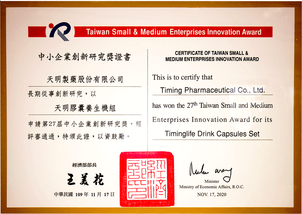天明製藥股份有限公司以「天明膠囊養生機組」標的榮獲「第27屆中小企業創新研究獎」,具有中藥沖泡機、新穎性膠囊包裝、生產線設備規劃三大特色及創新性,基於食補藥膳的概念,開發出多種新穎性包裝之中藥養生飲「膠囊」,同時研發出仿手工泡法之「膠囊沖泡機」,以確保沖提時有效萃取、安全充填及味道易入口等關鍵,克服中藥材不像咖啡粉易溶解、熱沖易產生香氣等特性。